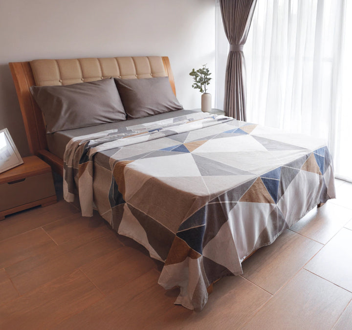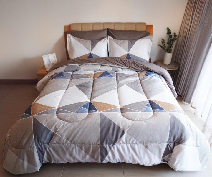 Combo Edredón doble faz geométrico café + juego de sabanas